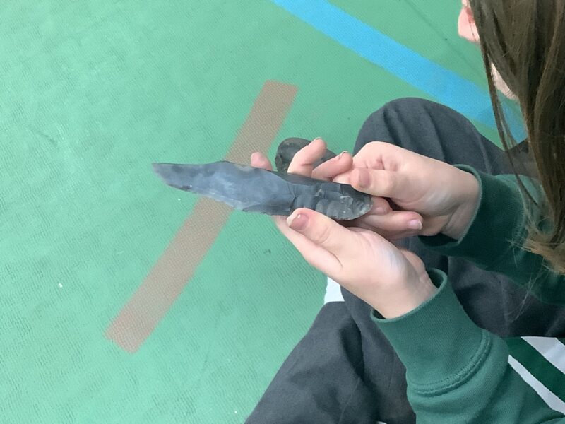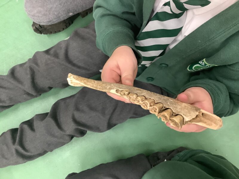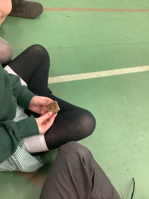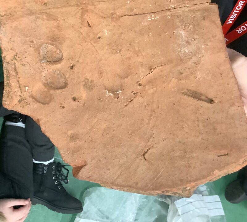 Children were able to handle different artefacts that have been found by archaeologists ranging from the Stone Age to the Roman era (these were not replicas). These included Stone Age tools, clay pottery, fossils & even paw-prints – you can see where a dog stood on a tile.